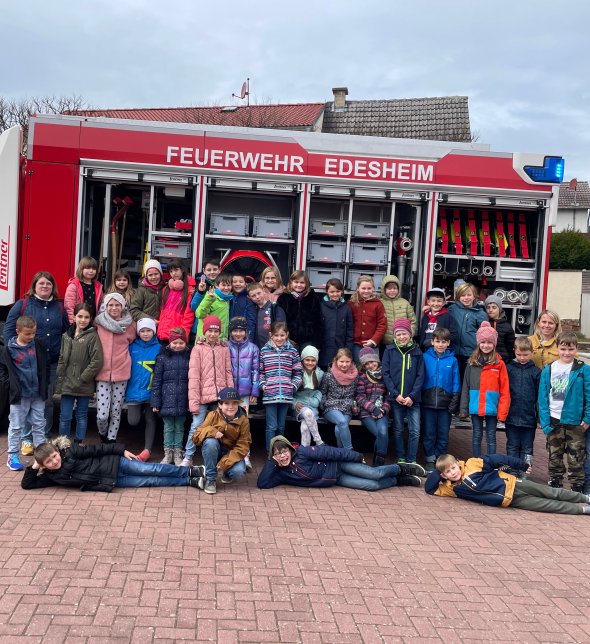 Am 21.03. besuchten unsere dritten Klassen die Edesheimer Feuerwehr. Nachdem die Kinder die verschiedenen Fahrzeuge und Geräte unter die Lupe genommen haben durften alle die Feuerwehrkleidung anziehen. Staunend stellten sie fest, dass diese richtig schwer ist.
