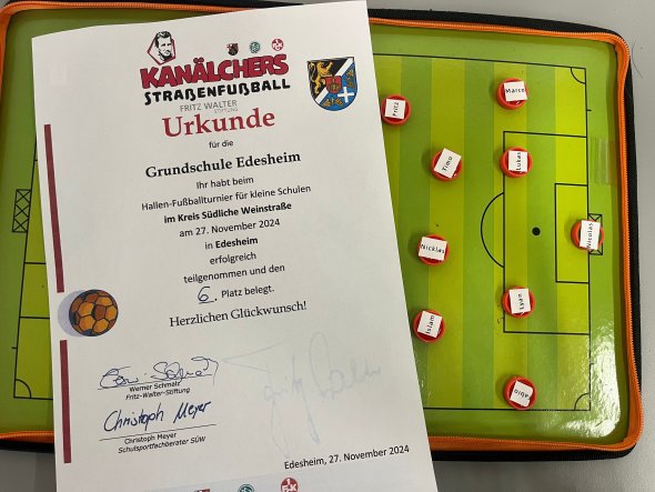 Nach langer Corona-Pause fand endlich wieder das Hallenfußballturnier für den Kreis SÜW statt. Die Grundschule Edesheim fuhr in Begleitung von Frau Busch und Frau Zeyer mit 12 hochmotivierten Jungs der 3. und 4. Klasse nach Herxheim. Sie spielten gegen die Schüler der GS Rohrbach und der GS Ilbesheim je ein Hin- und Rückspiel. Gegen die GS Ilbesheim konnten die Edesheimer Jungs das Hinspiel 20 Sekunden vor Schluss mit 1:0 für sich entscheiden. Im Rückspiel mussten sie sich leider mit 0:3 geschlagen geben. Das Hinspiel gegen Rohrbach verlief sehr ausgeglichen und endete unentschieden (0:0). Beim Rückspiel, dem letzten Spiel des gesamten Turniers, wurde es noch einmal spannend. Die Rohrbacher gingen zunächst in Führung, jedoch konnten die Edesheimer, durch eine gute Teamleistung, mit dem Schlusspfiff noch den Ausgleich erzielen und das Spiel endete 1:1. Durch diese großartige Leistung sicherten sich die Jungs der GS Edesheim den 2. Platz.