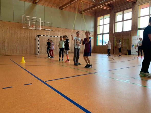 Mit großer Begeisterung nahmen unsere Viertklässler:innen am 24. November 2022 an einem Rope-Skipping-Kurs teil. Allein, zu zweit oder in größeren Gruppen übten und sprangen sie mit kleinen und langen Seilen. Staunend sahen sie, dass man mit viel Training sogar sitzend Seilhüpfen konnte. Nach zwei Stunden Training führten sie ihren Mitschüler:innen die neuen Sprünge zu fetziger Musik vor.