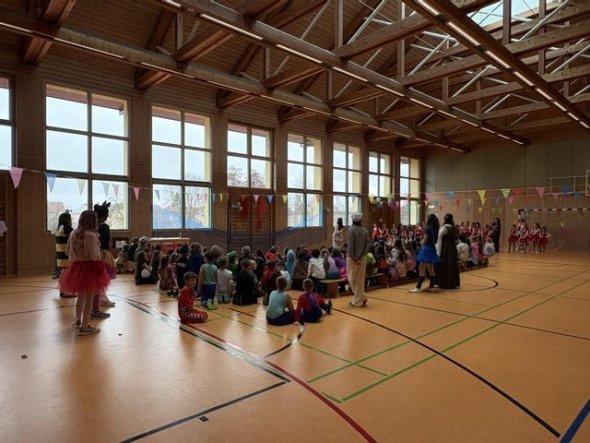 Vor der Pause starteten wir wie jedes Jahr unsere Polonaise durchs Schulhaus, tanzende Kinder, Bonbons in den Fluren und ausgelassene Stimmung. Dann ging unsere traditionelle Faschingsfeier in der Turnhalle los. Rund 180 Kinder feierten mit uns gemeinsam eine tolle Faschingsparty. Neben einer schwungvollen Büttenrede, einem bezaubernden Tanzmariechen, dem grandiosen Auftritt der Garde gab es lustige Spiele und weitere Highlights aus der Schülerschaft. Selbst die Lehrerinnen und Lehrer traten in Aktion! Viele fantasievoll verkleidete Kinder und jede Menge Spaß - das war unsere Faschingsfeier!
