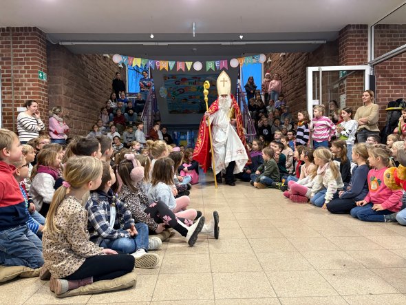 Dieses Jahr bekamen wir bereits am 5. Dezember Besuch vom Nikolaus. Die Kinder staunten nicht schlecht, als er persönlich im Foyer stand. Jedes Kind erhielt einen Schoko-Lolli, und jede Klasse durfte sich zusätzlich über ein gemeinsames Geschenk freuen: das beliebte Spiel „Skyjo“.
